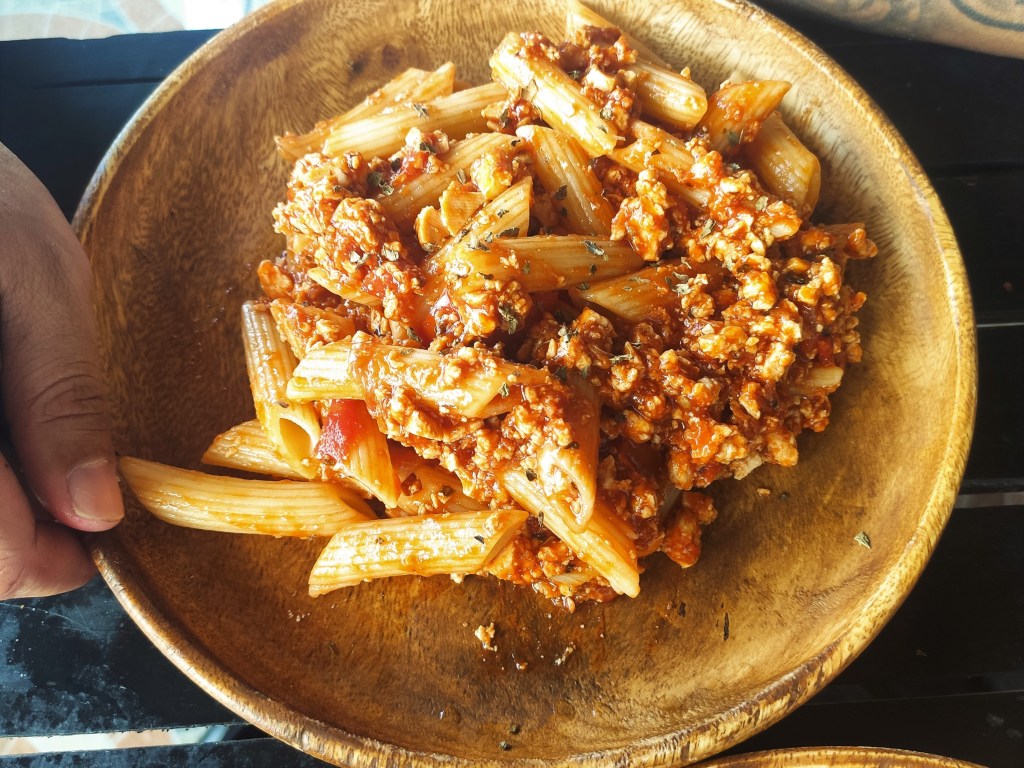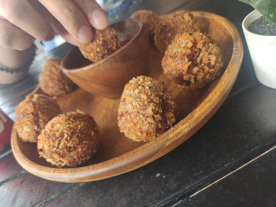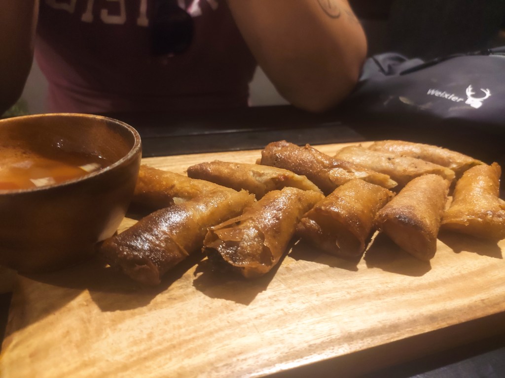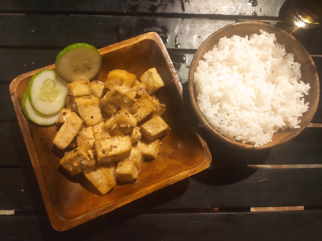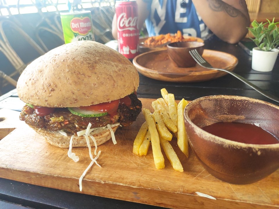 We visited a couple of times and some items on the menu weren’t available. The first time we went we tried the vegetable spring rolls and the sizzling tofu with rice. The second visit we shared the curry croquets, Oliver had the spaghetti bolognese and I had the ultimate vegan burger. The spaghetti bolognese was interesting, the bolognese was made of tofu instead of tvp soy mince type substance, which was different, I enjoyed my sneaky tastes of it. The burger was lovely, fresh and made of wholefoods rather than meat substitute, I enjoyed it. The prices were okay, a little more expensive than other places in the town, ranging from around 340 – 420 pesos for a main course (€6-7 at the time of writing).