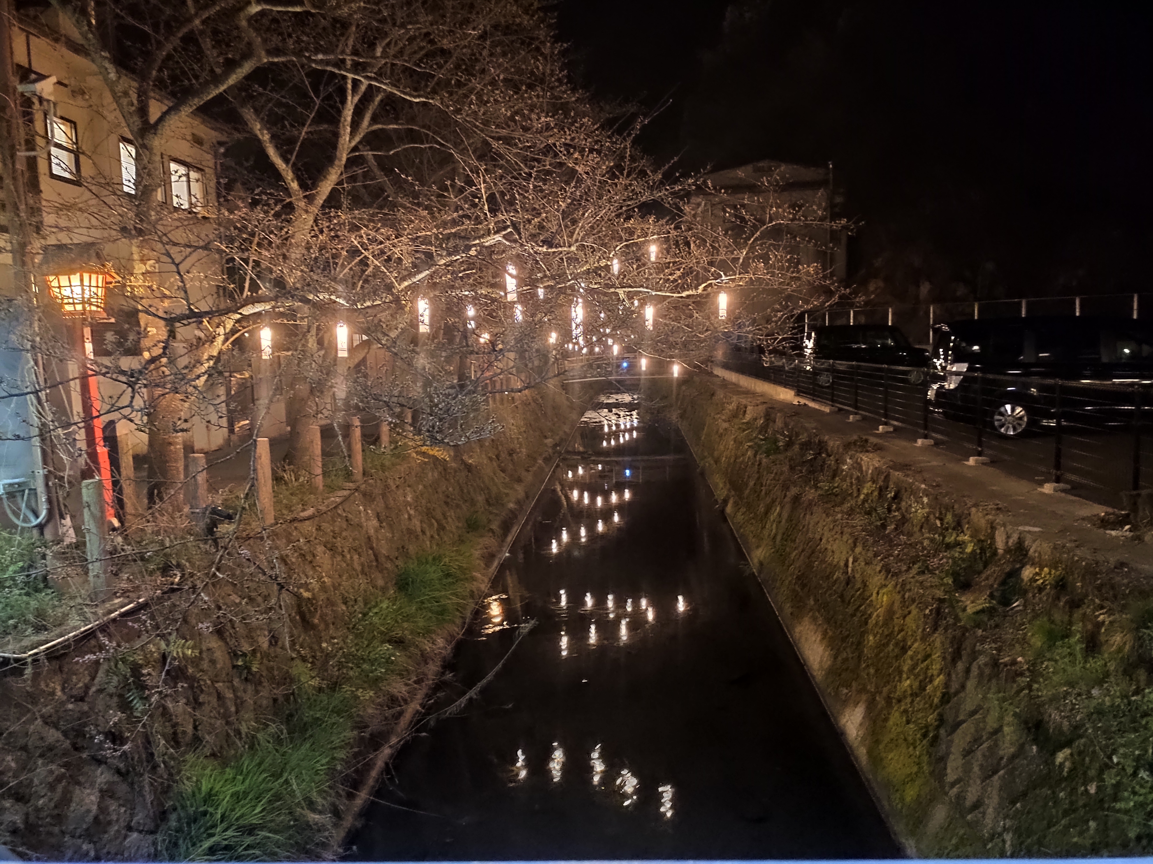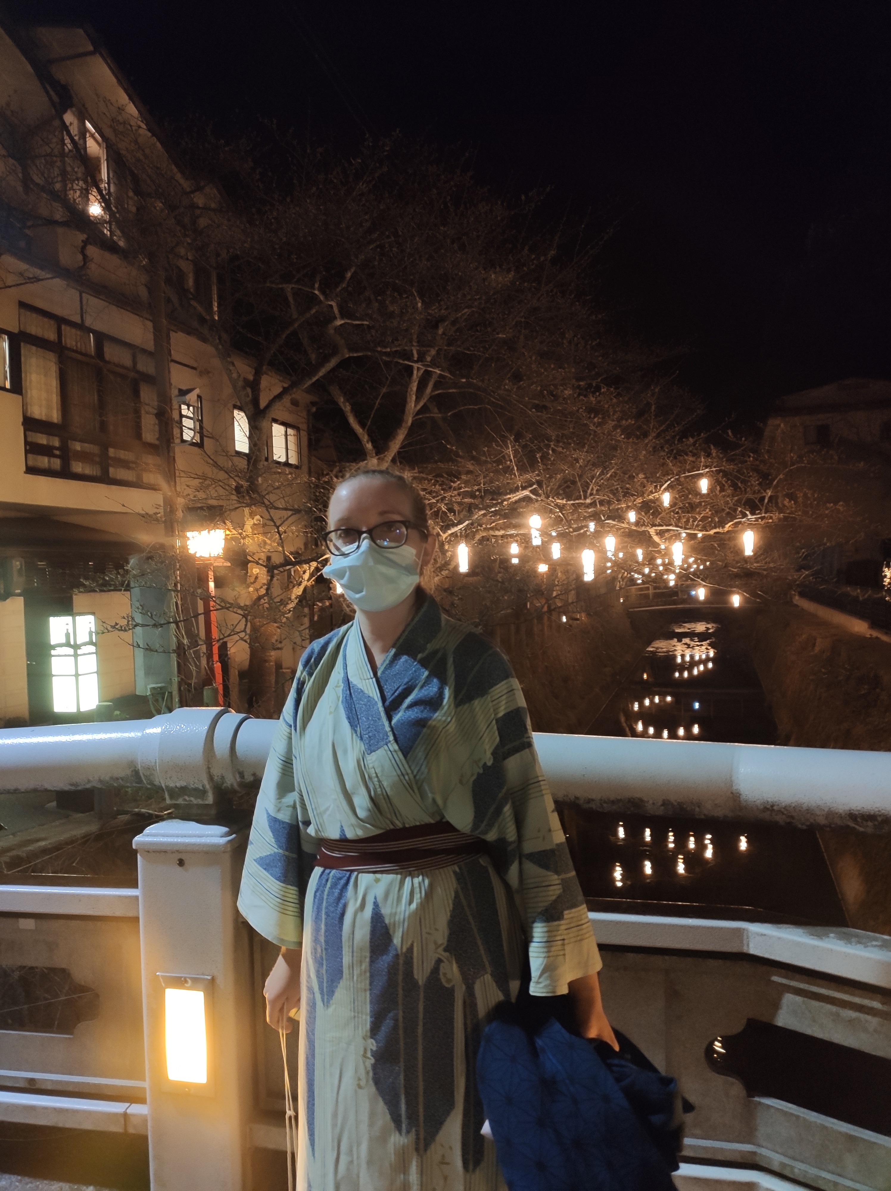 Lanterns lighting up the river at night, and me in a yukata